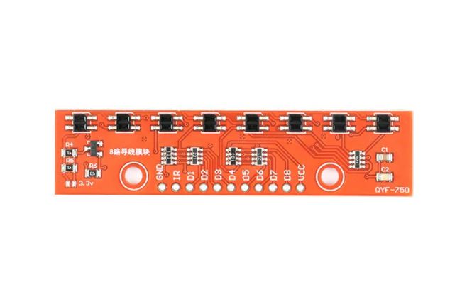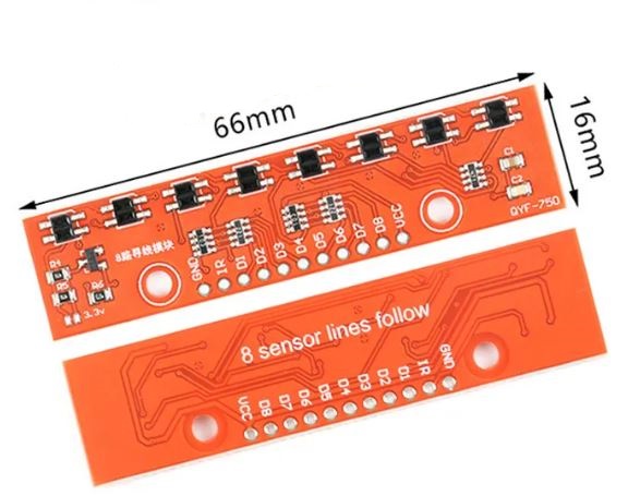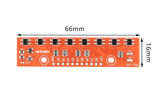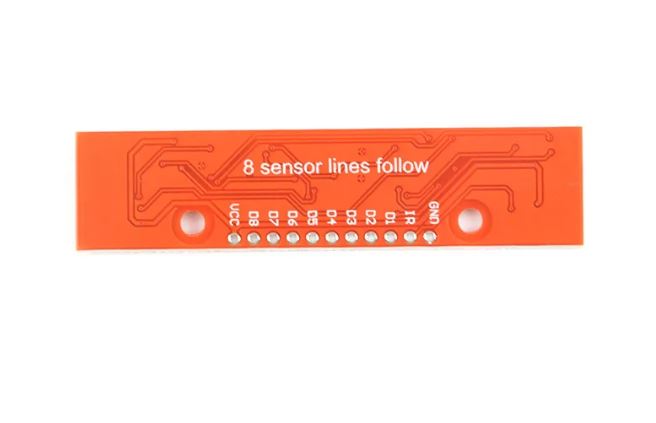 Módulo que posee 8 pares LED IR/fototransistor, ideal para usar en seguidores de línea, tiene una salida analógica para cada sensor, también permite controlar el encendido de los LED IR mediante el pin «IR», facilitando el ahorro de energía cuando se requiera.