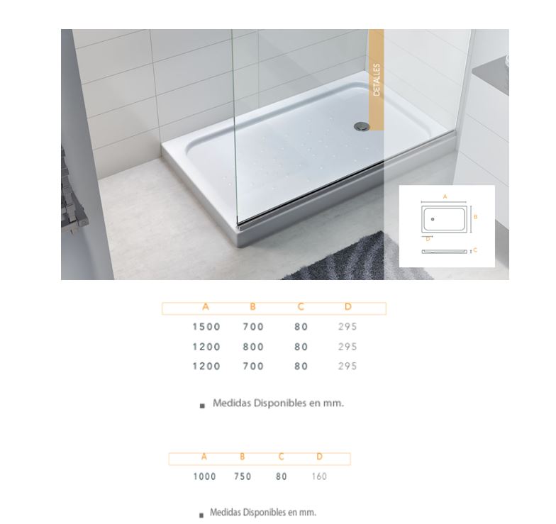 Largo: 120cm. Ancho: 80cm. Profundidad: 8cm. Plato de Ducha BAGNARA: Diseñado para maximizar el espacio sin renunciar al confort. El diseño antideslizante de su superficie contribuye a evitar resbalones. Su estructura de laminado de acrílico y ABS (polímero de ingeniería) permite que se combine elasticidad y dureza superficial, reforzado con poliuretano de expansión controlada.