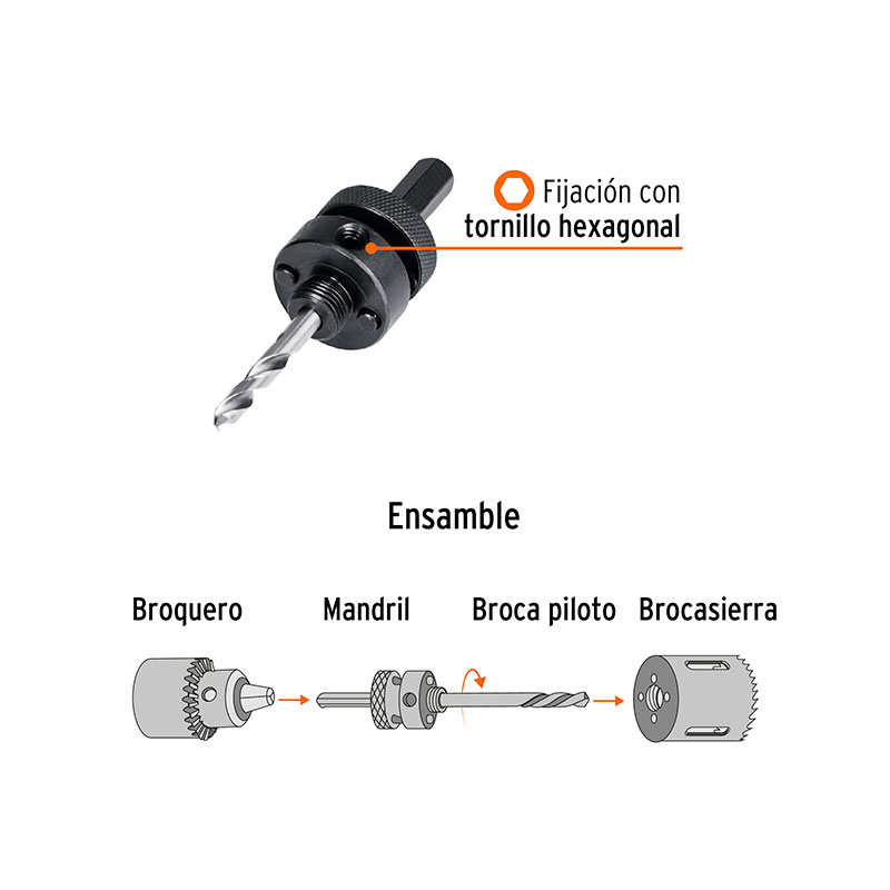 - Tornillo hexagonal para mejor sujeción y ajuste de la broca piloto.