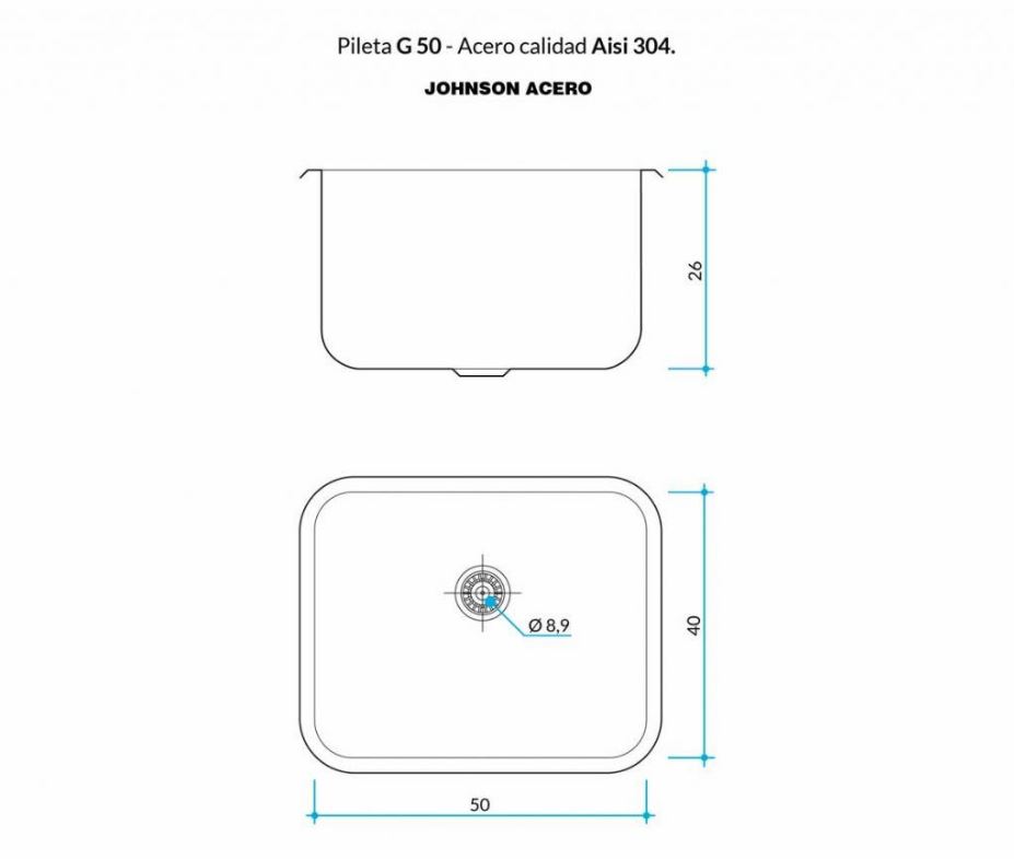 Pileta simple Pegar. Modelo G50. Acero Pulido 304. Medidas: 50 x 40 x 25 cm. Capacidad: 45 Lts.