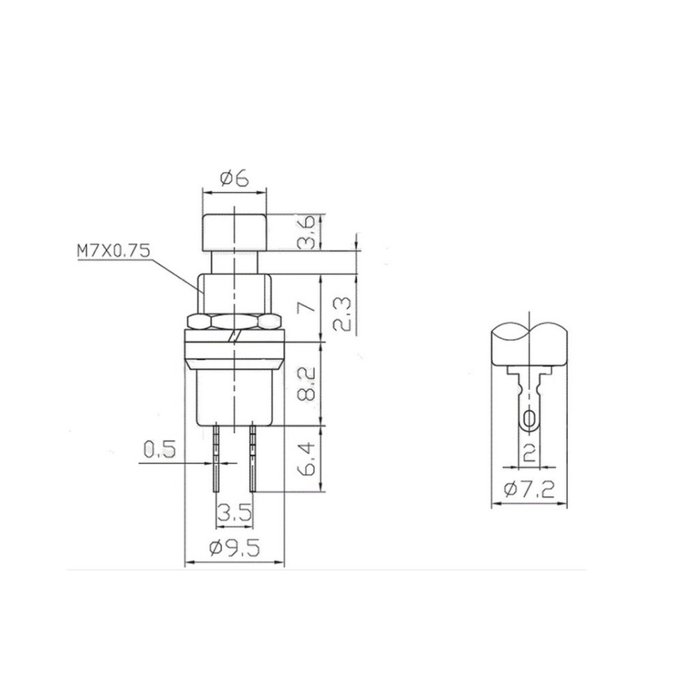 Soporta una carga de 2A/125v o 1A/220v. Consta de un contacto momentáneo normalmente abierto (NO) con retorno automático a la posición de reposo, es decir, solo deja pasar la corriente mientas ejercemos presión sobre la tecla, una vez dejamos de presionar, el mecanismo vuelve a su posición de reposo inicial con la ayuda de un muelle. Para su montaje solo se necesita hacer un agujero de 7mm de diámetro, se puede colocar en cualquier panel que no tenga más de 2mm de grosor y es muy fácil de ajustar gracias a su tuerca de ajuste.